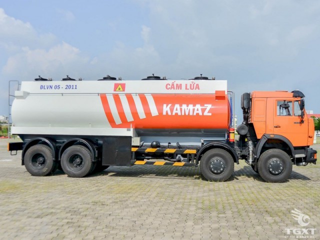 Xe bồn chở xăng dầu Kamaz 20 khối đóng thùng trên nền cơ sở xe tải Kamaz 6450 nhập khẩu nguyên chiếc được trang bị động cơ có dung tich 10.850cc cho công suất mạnh mẽ, vận hành tốt trên mọi địa hình. Bồn chở nhiên liệu với dung tích 23 khối được đóng bằng thép ngoại nhập chất lượng cao, công nghệ sơn tĩnh điện chống ăn mòn điện hóa, tăng tính an toàn, tăng tuổi thọ bồn, đồng thời không làm giảm chất lượng cho nhiên liệu bên trong.