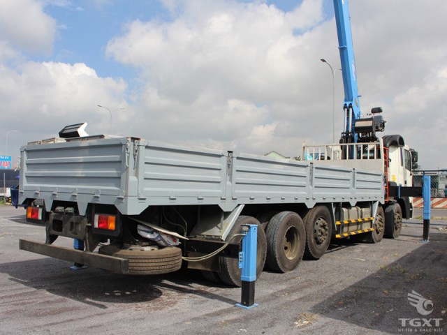 Xe tải Hyundai HD360 gắn cẩu Dongyang sau khi gắn cẩu có tải trọng cho phép chở 13900kg, kích thước lòng thùng hàng 8400 x 2350 x 650/— mm đáp ứng tốt nhu cầu chuyên chở hàng hóa với tải trọng nặng, đa dạng trên thị trường. Cẩu Dongyang 10 tấn 5 khúc SS1015 với thiết kế 5 đoạn có khối lượng nâng tối đa 1000kg tại 3m và 600kg tại 24,9m. Vận hành bằng thủy lực. Hệ thống điều khiển cần hiện đại, dễ dàng sử dụng.